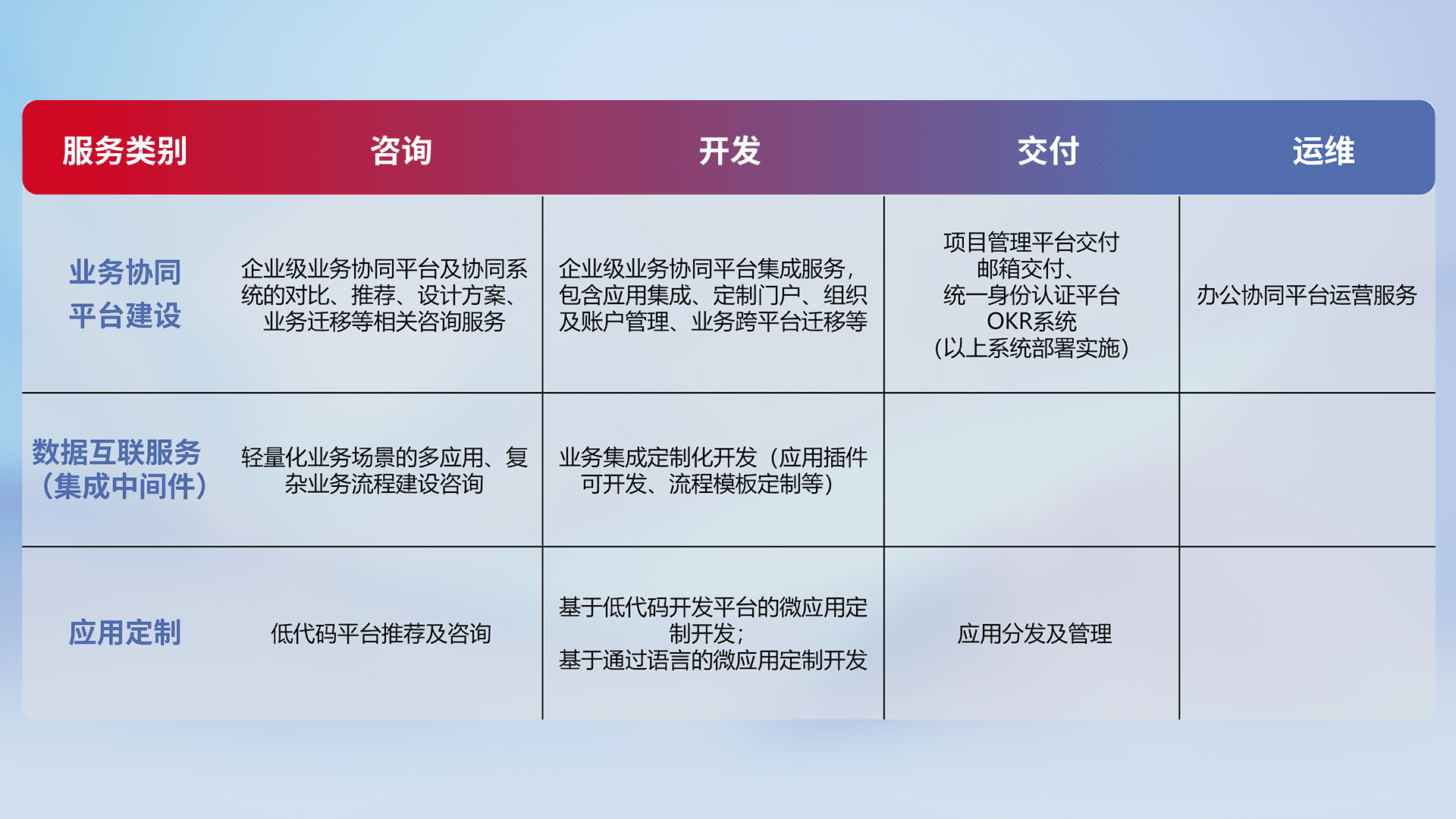 针对钉钉、、、、企微、、IDaas等平台级产品提供产品的规划、、方案、、、、交付、、、、定制化开发等服务,,实现如统一协同办公、、智能客户服务、、混合会议管理、、智能数据查询、、、等业务场景,,实现数字化转型。。。。