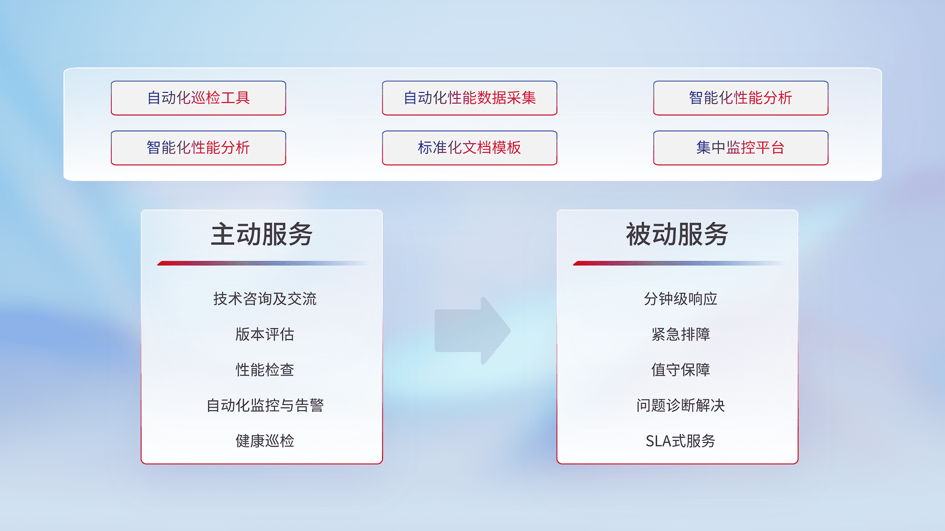 智能化工具和标准化文档,,,保障服务质量,,,,提供主动服务(包含技术咨询、、、、版本评估、、性能检查、、、自动化监控与告警、、健康巡检)和被动服务包含(分钟级响应、、、、紧急排障、、、、值守保障、、问题诊断解决、、SLA服务)。。。
